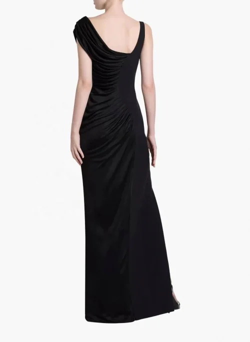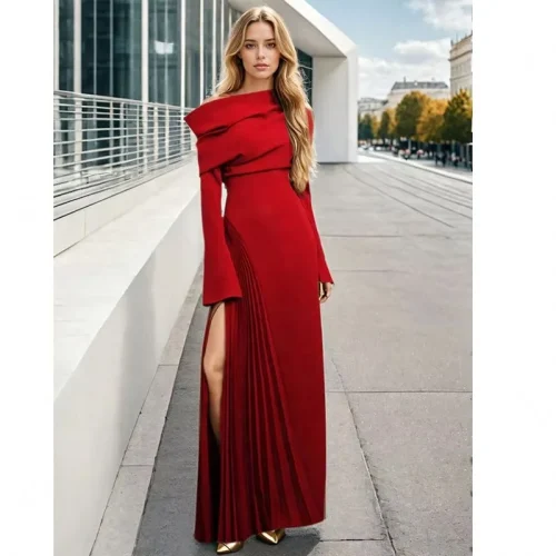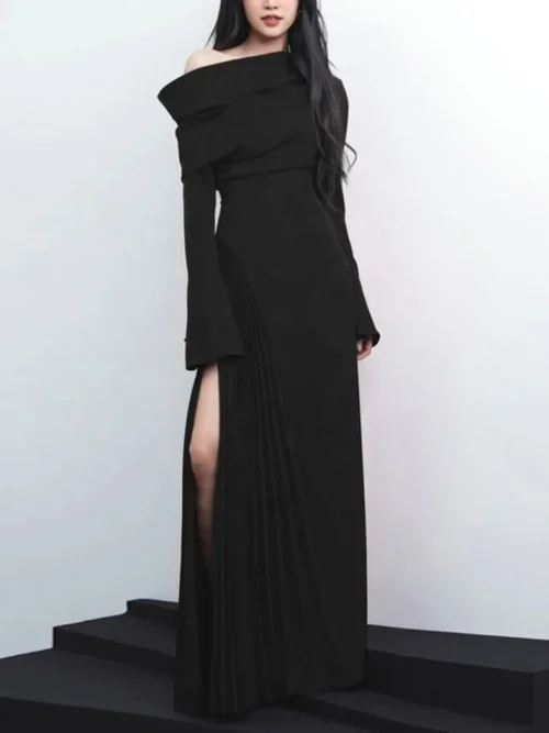 YC 2025 Autumn New Women’s Elegant Dress Ankle-Length Slim High Waist Side Slit Diagonal Collar Pleated Casual Solid