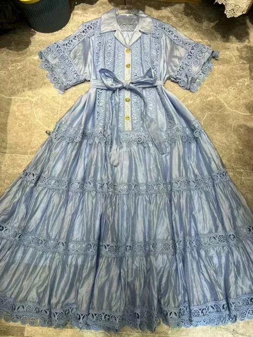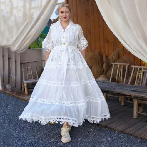 YC Fashion Designer Loose Long Dress Women 2025 Spring Summer Turn-down Collar Flower Embroidery Hollow Out Casual Party