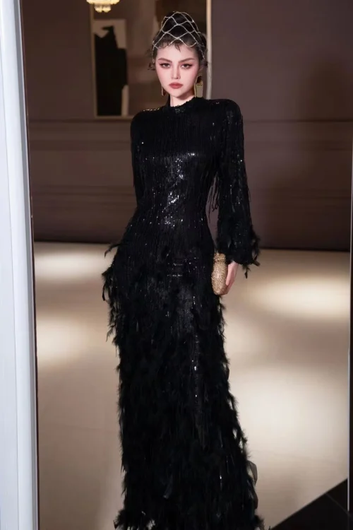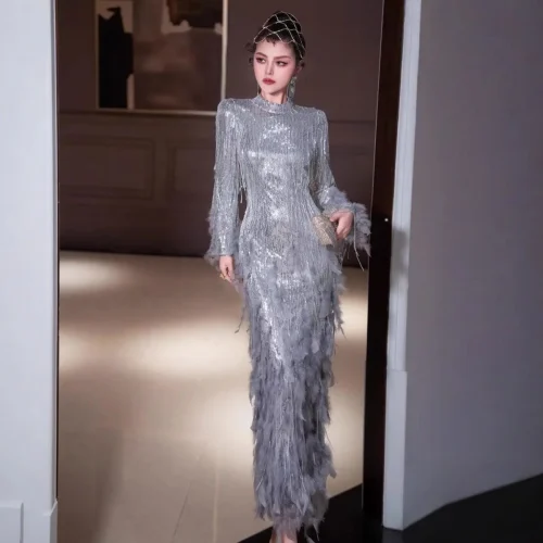 YC High Quality Evening Dress Women Spring Summer Sequined Beading Tassel Feather Slim Ceremony Party Banquet Birthday