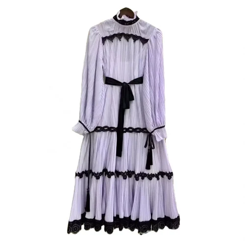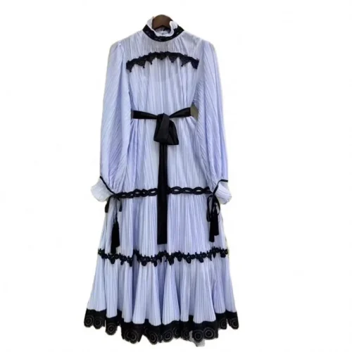 YC 2025 Spring Summer Loose Dress Women Long Sleeve Pleated Belt Lace Patchwork Ruffled Belt Casual Vacation Casual