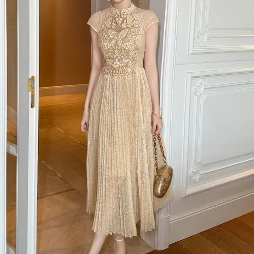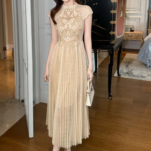 ZYHT 9880 New Party Women Casual Formal Dress Fashion Lace Pleated Long Dress Short Sleeve Elegant Summer Dress for Woman