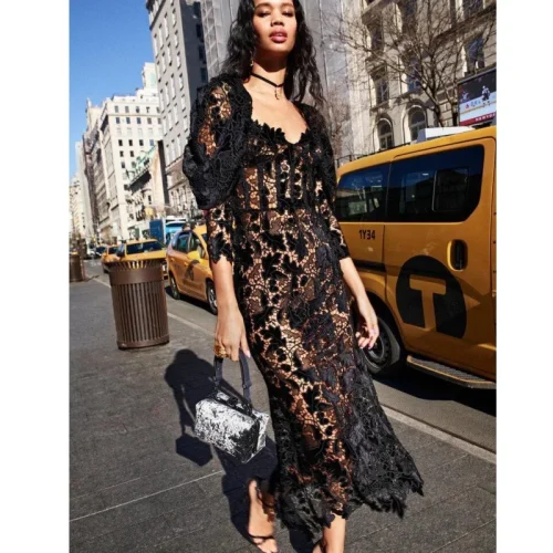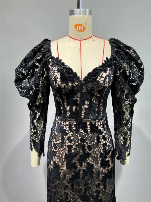 2024 Princess Sleeve Sexy See-through Black Cut-out Lace Dress Elegant Party Dinner Dress