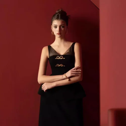 2024 New Women’s Fashion Black Long Dress Socialite Style Waist Slimming Elegant Women Dress Set