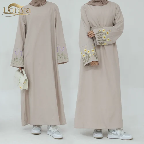2024 Ramadan Loriya Flora Abaya Islamic Clothing Linen Fabric Casual Dresses With Embroidery Flowers Abaya Women Muslim Dress