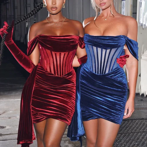2024 Sexy Velvet Off-Shoulder Sheer Pleated Hip Wrapped Short Skirt Dress Women Casuales Ropa Vestidos