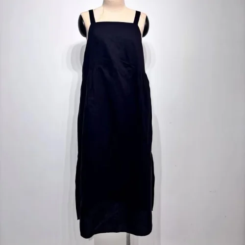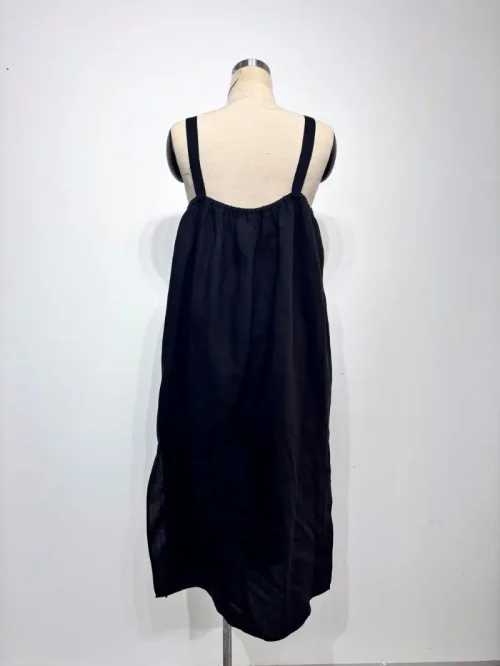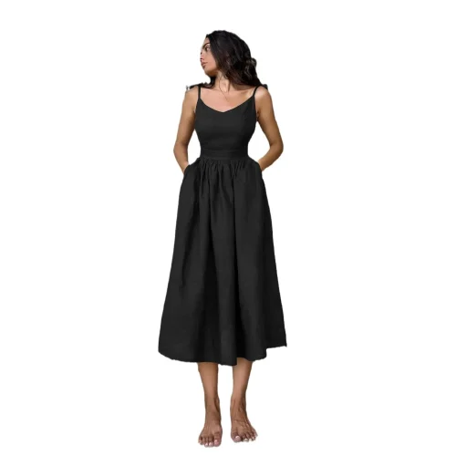 2025 Casual Summer Sleeveless Square Neck Smocked Back Loose Black Linen Dress with Side Slit