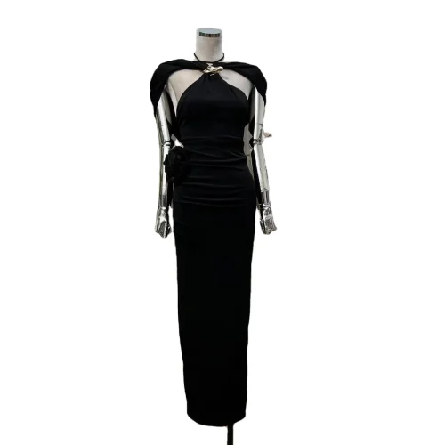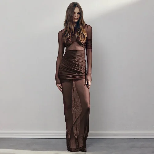 2025 European American Style Cross-Border Dress – Long Casual Sexy Slim Fit Ruched Mesh Sheer Woven Weaving Method