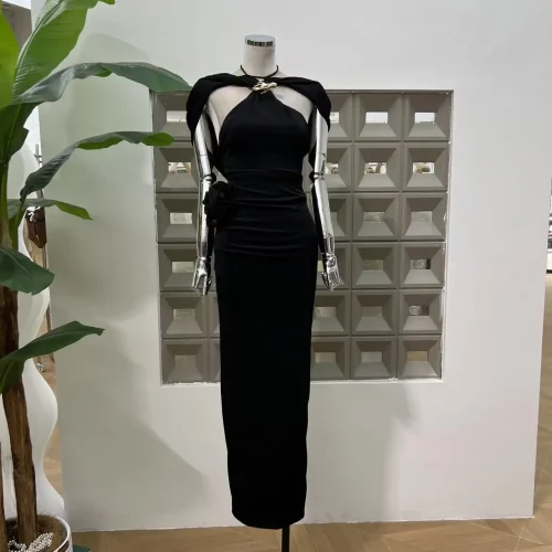 2025 High Quality Fashion Summer Long Casual Dress Dark 3D Flower Strap Backless Hooded Black Sleeveless Slim Sexy Party Dress