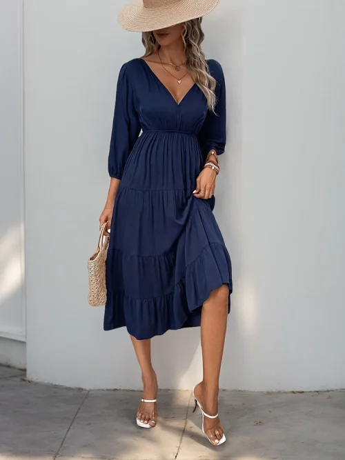 2025 High Quality Women’s Casual Dresses Elegant V-Neck Backless Solid Color Pleated Summer Dress
