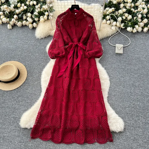 2025 Elegant Vintage KOREAN STYLE Lantern Sleeve Hollow Embroidered Lace Dress Casual Dresses
