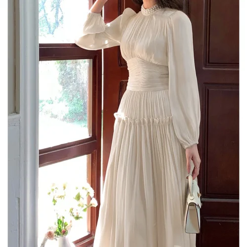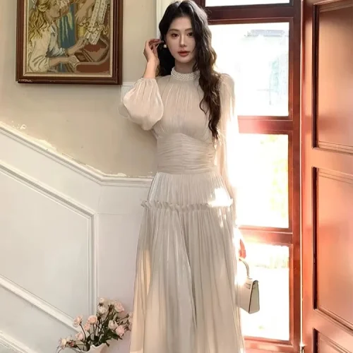 2025 Elegant O-Neck Ruched Anti-Static Long Puff Sleeve Maxi Dress Chiffon Natural Waist Casual Summer Service