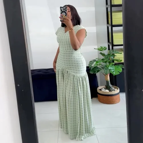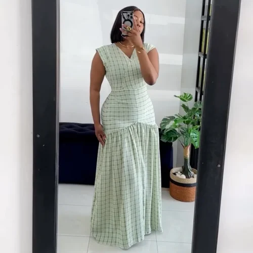 2025 ization Summer Casual Plus Size V Neck Sleeveless Plaid Color Fit a Line Maxi Dress Women
