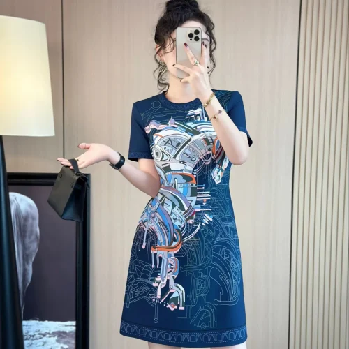 2025 Spring Summer Collection Elegant Vintage Printed French Dress Short-Sleeved Neck Slim-Fit Style Casual