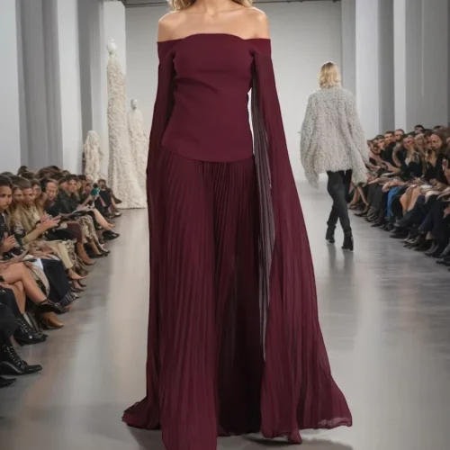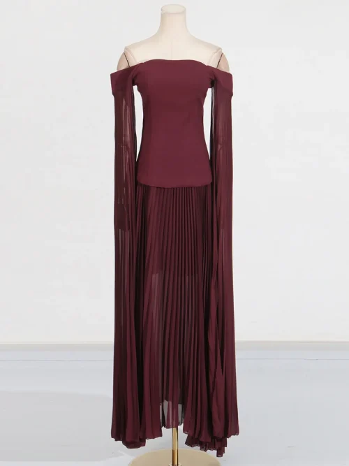 2025 Spring New Fashion Best Ladies Suit Mesh Pleated Long Sleeve Elegant Shoulder Stitching Angora Red Casual Dress