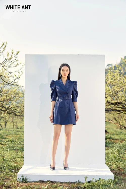 Eco Friendly Stylish Organic Cotton Blue Lapel Collar Dresses With Waist Belt Jacquard Dresses Women Lady Elegant Button Decor