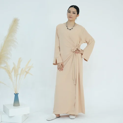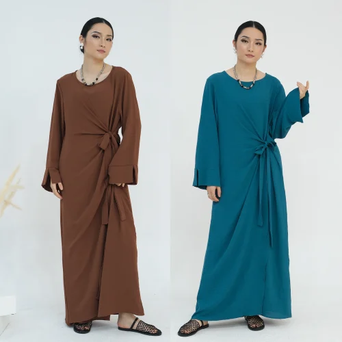 Dubai Abaya Manufacturer Elegant Casual Wear Tie Belt Wrap Long Dresses Solid Color Slit Sleeves Modest Abaya Women Muslim Dress