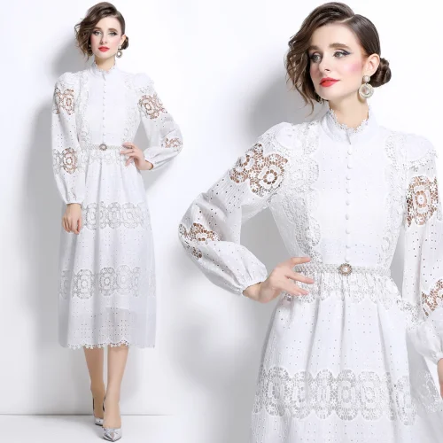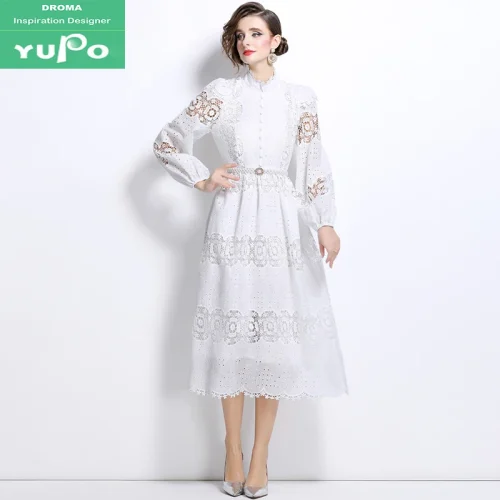 Droma in Stock Fashion Casual Slimming Patchwork Lace Dresses for Ladies Long Sleeve White Dress for Women