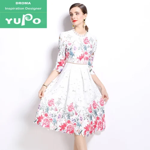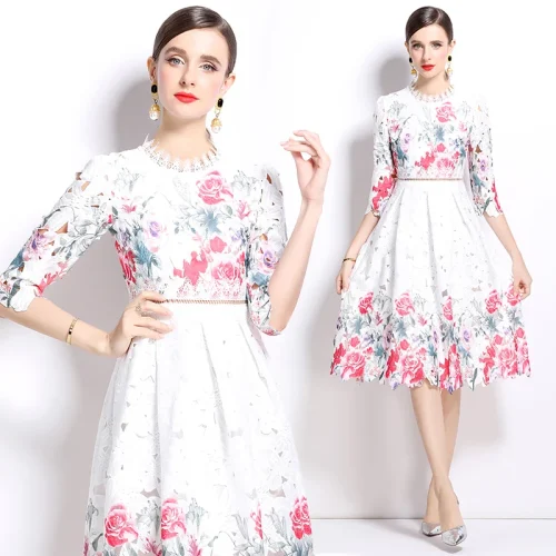 Droma in Stock Fashion Vintage Hollow Out Lace Midi Length Floral Casual Dresses Elegant Women Lady