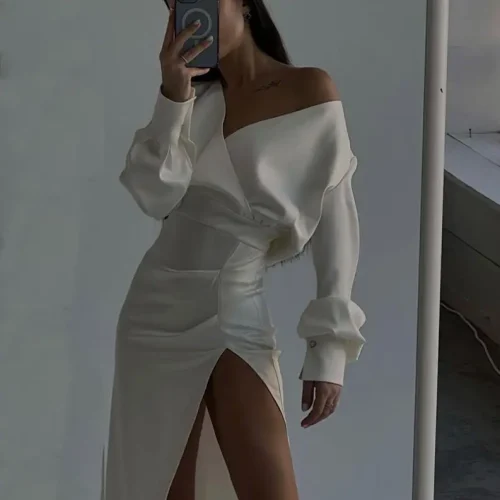 Dropshipping Elegant Women Bride Party Night Gown Robes Woven Fabric Off Shoulder Long Sleeves Casual Dresses