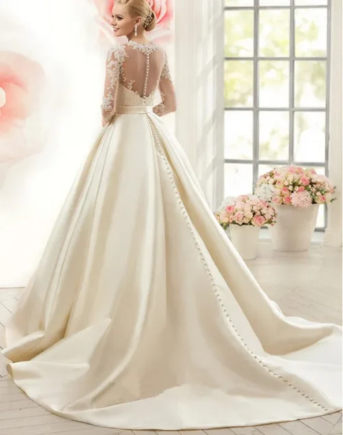 Elegant Casual Dresses Stain Princesses Bridal Gowns Dress Champagne Satin Lace Appliques Beaded Belt Wedding Dresses
