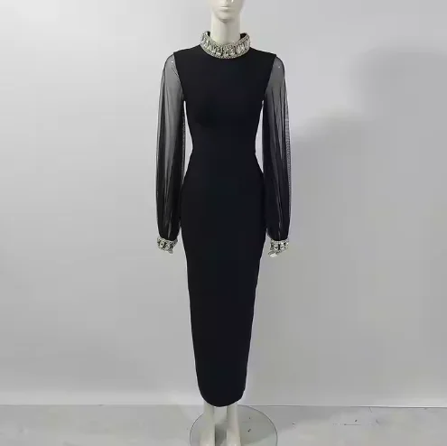 Elegant Casual Black Chiffon Maxi Dress Diamond Patchwork Long Sleeves Zipper Decoration Natural Waistline Eco-Friendly Midi