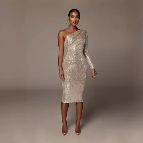 Elegant Casual Gold Sequins Bodycon Prom Dresses for Women New Fashion One Shoulder Halter Neckline Woven Pattern