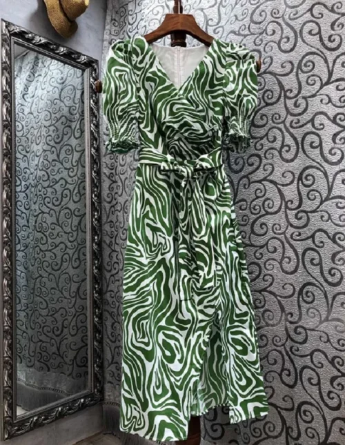 100%Cotton Dress New 2021 Spring Summer Fashion Clothing Women Sexy V-Neck Short Sleeve Mid-Calf Length Casual Green Dress XL