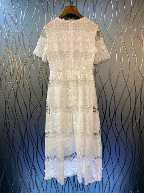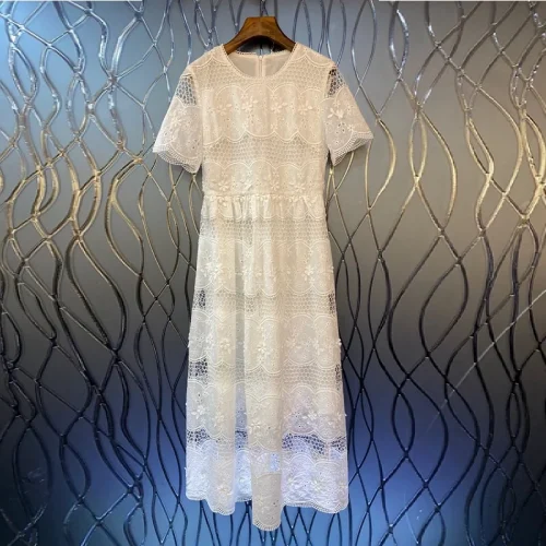 100%Cotton Long Dress 2023 Summer Style Women O-Neck Hollow Out Lace Embroidery Short Sleeve Casual Party White Maxi Dress Chic