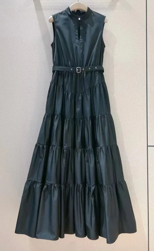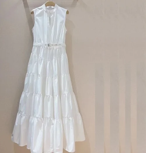 100%Cotton Long Dress 2024 Spring Summer Style Women Belt Deco Sleeveless High Waist Long WhiteMaxi Dress Luxurious Lady