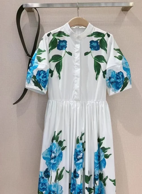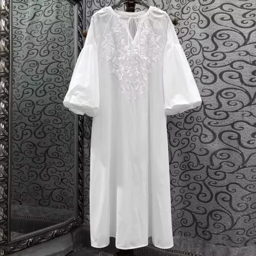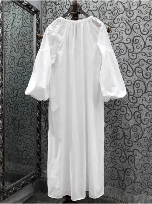 100%Cotton Dress 2024 Summer Fashion Style Women Luxurious Embroidery Lantern Sleeve Mid-Calf Straight White Black Loose Dress