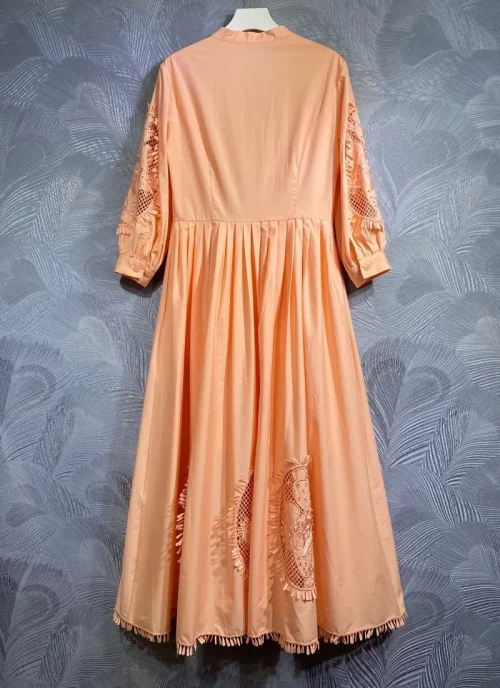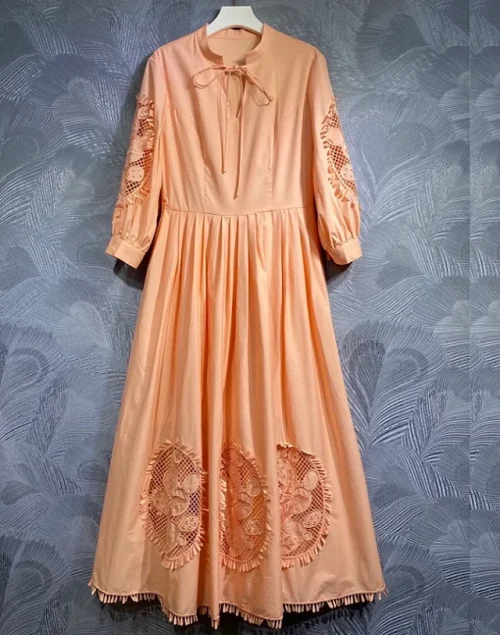 100%Cotton Long Dress 2024 Spring Party Evening Women Lace Embroidery 3/4 Sleeve Elegant Long White Orange Maxi Dress Vestidos