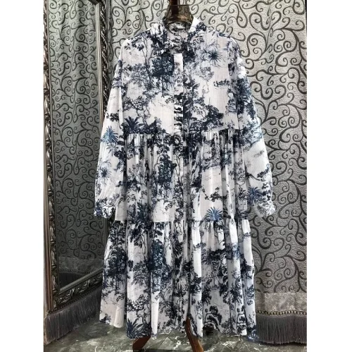 100%Cotton Dress 2025 Spring Fashion Women Vintage Ink Painting Prints Long Sleeve Mid-Calf Length Casual Long Shirt Dress Retro