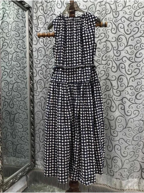 100%Cotton Dress 2024 Summer Designer Fashion Clothes Women Polka Dot Prints Belt Dress Ladies Sleeveless Mid-Calf Vintage Dress
