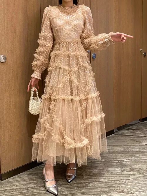 Elegant Ladies Casual Dress Autumn New Sleeveless Waist Tight Cake Design Multi-Level Pleated Mesh Solid Pattern Sexy Ear-rimmed
