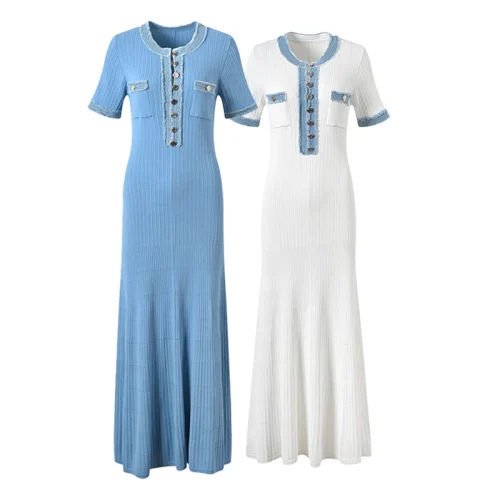 Elegant Short Sleeve Bodycon Ladies Fashion Single-breasted Maxi Dresses 2024 Spring Summer Knitted Bettergirl O-neckline Women
