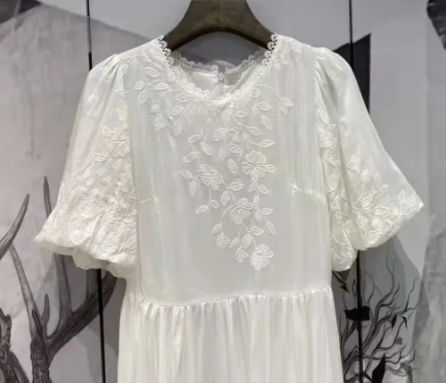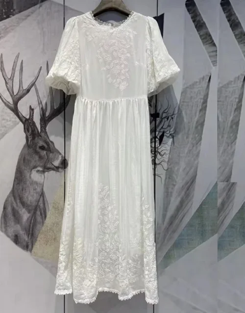 High Quality Cotton Dress 2022 Summer Fashion Style Women Luxurious Embroidery Short Sleeve Mid-Calf Casual White Dress Boho XL