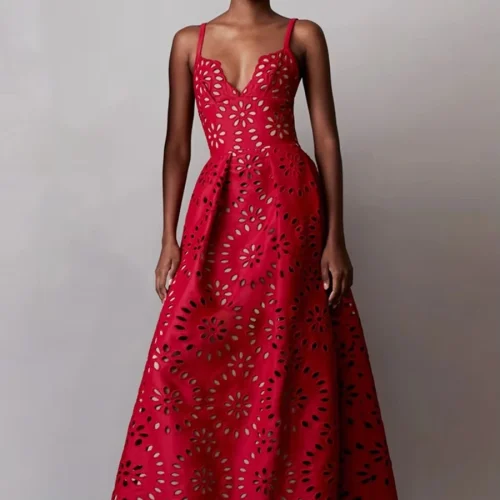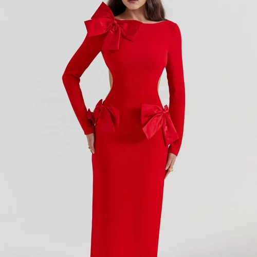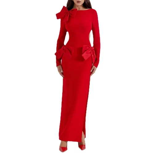 GS Elegant Red Bow Maxi Dress – Eye-Catching Formal Attire for Red Carpet Events