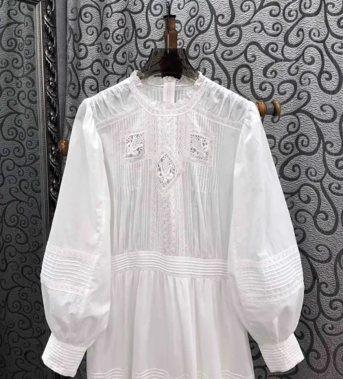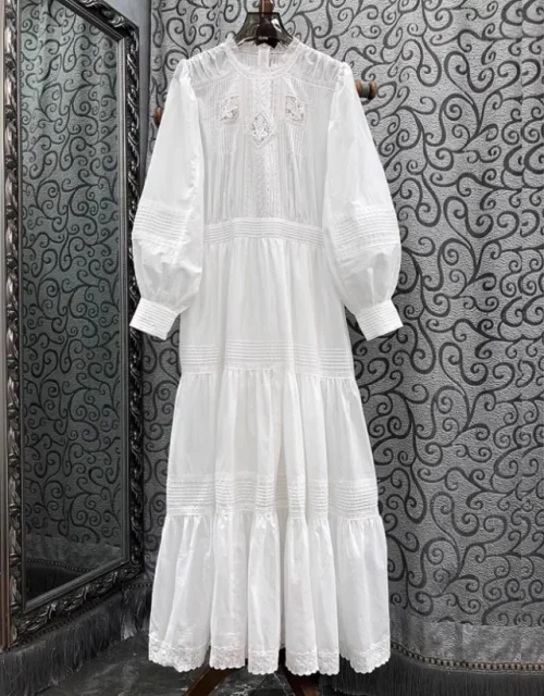 100%Cotton Long Dress 2025 Spring Designer Women Crochet Lace Embroidery Patchwork Long Sleeve Luxurious Lady White Maxi Dress