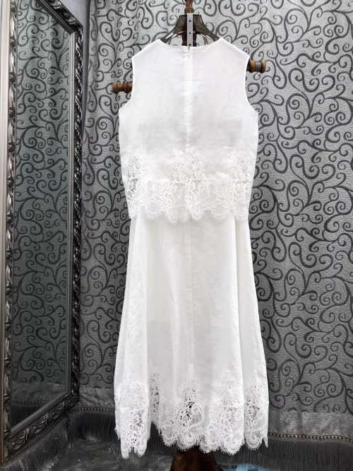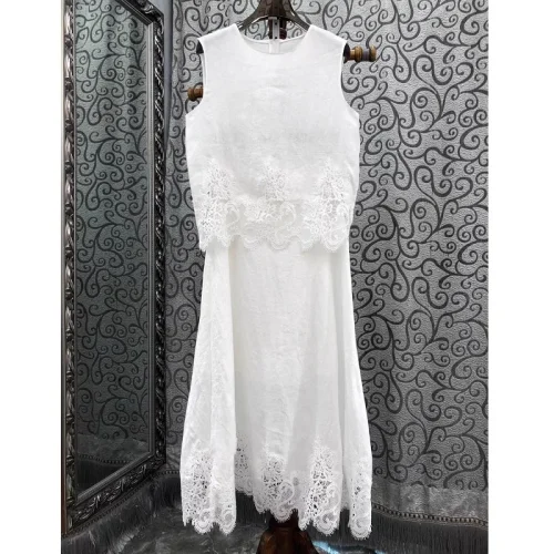 100%Linen Women’s Set 2025 Summer Clothes Set Lady Sexy Lace Patchwork Linen Tops+High Waist Long Linen Skirt Suit Sets 2pcs