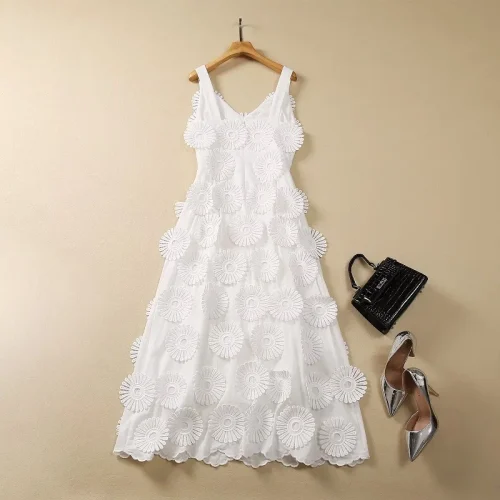 100%Cotton Long Dress 2024 Summer Party Evening Women Spaghetti Strap Allover Appliques Flower Embroidery Long White Dress Maxi
