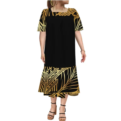 10036-T- Mumu Muumuu Hawaiian Flower Print Square Collar Micronesian Dress Plus Size Womens Fishtail Dress