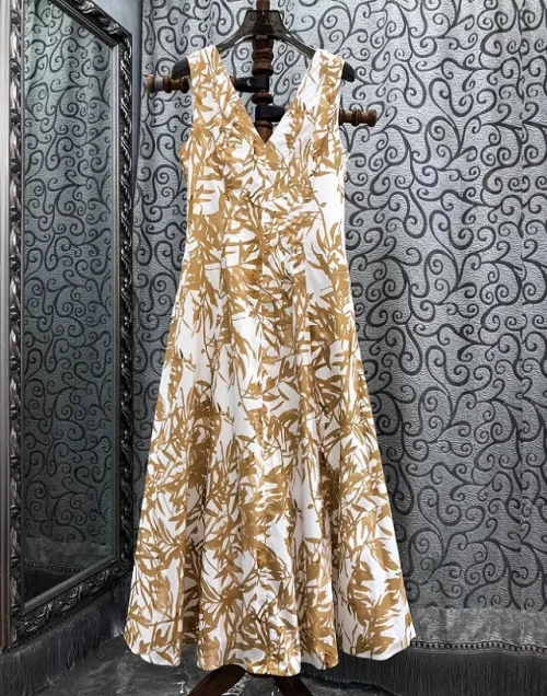 100%Cotton Long Dress 2025 Summer Style Women Sexy V-Neck Yellow Leaves Prints Sexy Sleeveless Casual Party Long Maxi Dresses