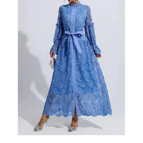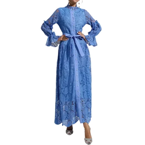 Women’s Size Blue Casual Maxi Dress Elegant Floral Print Lace Puff Long Sleeved Breathable Loose Fit for Daily Vacation