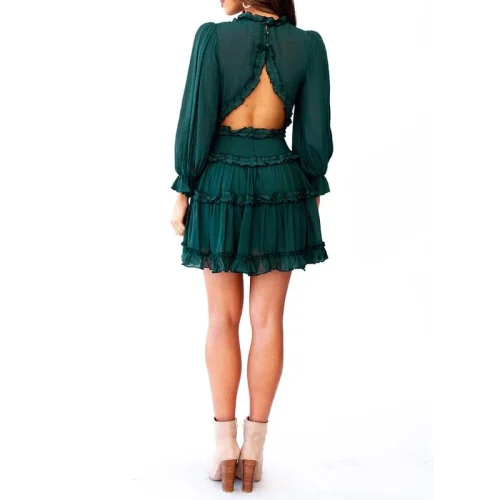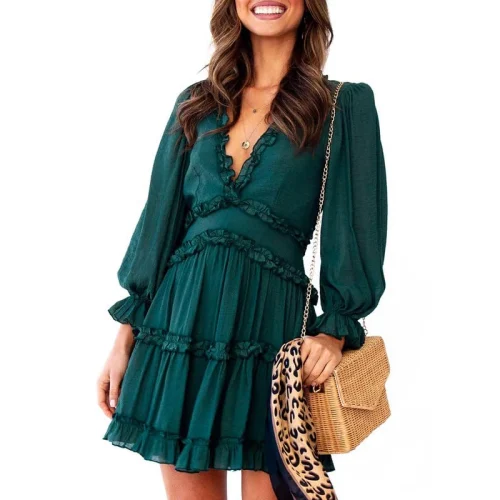Women’s 2024 Summer Spring Casual Mini Dress Deep V-Neck Ruffle With Open Back Long Sleeve Flowy Design Knee-Length