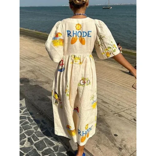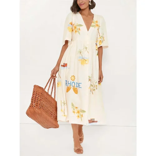 Women’s Spring&Summer Casual Cotton and Linen Elegant Rhodes Print Hawaiian Print Short Sleeve V Neck Midi Dress