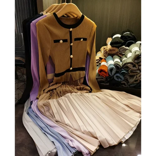 Women’s 2025 Spring Classic round Neck Pleated Skirt Dress High-End Long Sleeved Casual Style with Natural Waistline
