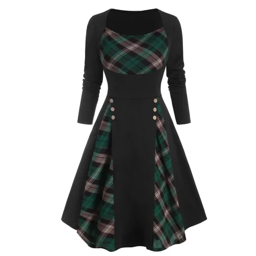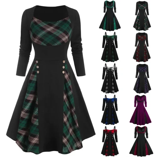Women’s Dress 2025 Dresses Vintage Round Neck Plaid Patchwork Mock Button Long Sleeve Dress Cocktail