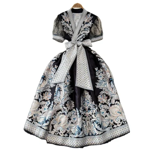 Women’s Mid-Length Dress Floral Embroidered Print Tie Casual Outerwear with Lace Decoration