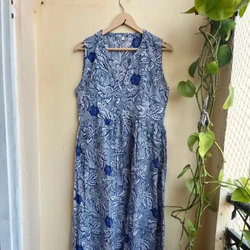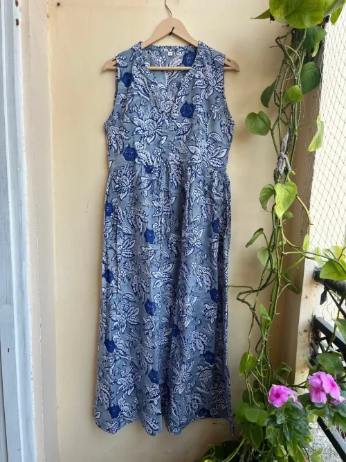 Women’s Sleeveless Indian Cotton Summer Dress blue Long Gown with Hand Block Printed Floral Design ODM Supply