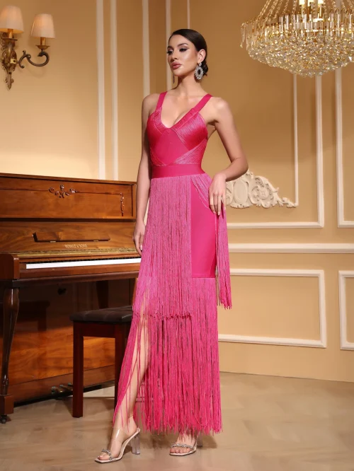 Women’s Slim-Fit Banquet Red Carpet Dress Two-Color Pleated Fringe Deep V High-Set Stars for Day Parties Summer
